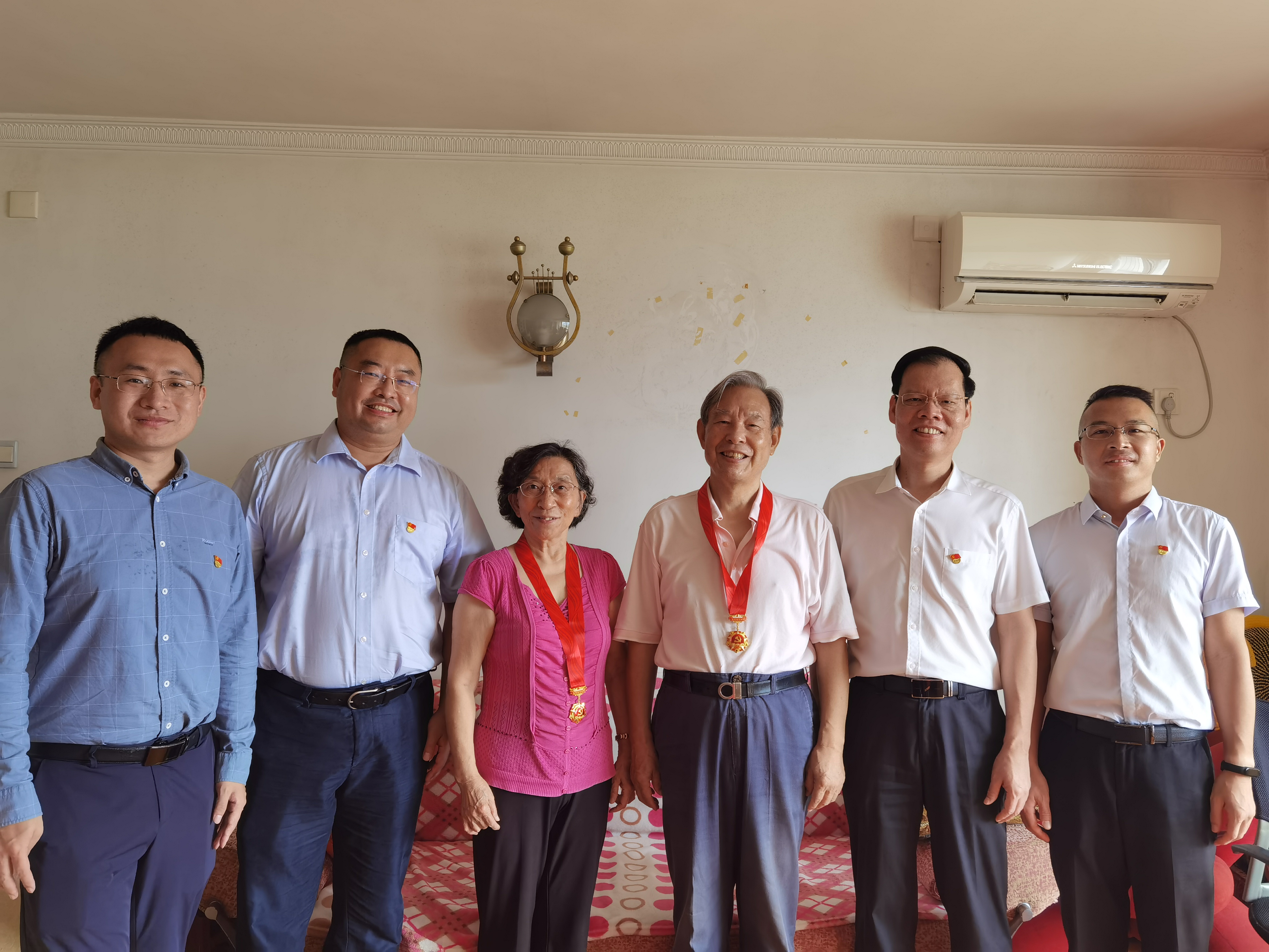 “收到黨組織的關心,特別高興和自豪,雖然身體活動不便,也一定要站起來”,87歲的老黨員連環(huán)雄精神抖擻、爽朗的話語感染著在場的人。他同時也是在一個紅色大家庭中,家里近親中有10名超過50年黨齡的老黨員,早年進入東江縱隊,參加淮海戰(zhàn)役、渡江戰(zhàn)役,解放上海、舟山等戰(zhàn)斗,后到蘇聯(lián)留學,歸國后參與秦山核電站、大亞灣核電站建設,榮獲核工業(yè)部頒發(fā)的“長期從事核工業(yè)建設榮譽證書”。王海龍為他佩戴上“光榮在黨50年”紀念章,并親切詢問他身體狀況。他表示,紅色故事感染著人、激勵著人,老黨員的貢獻,黨組織永遠不會忘記,一定要大力發(fā)揚他們身上的紅色傳統(tǒng),傳承紅色基因。