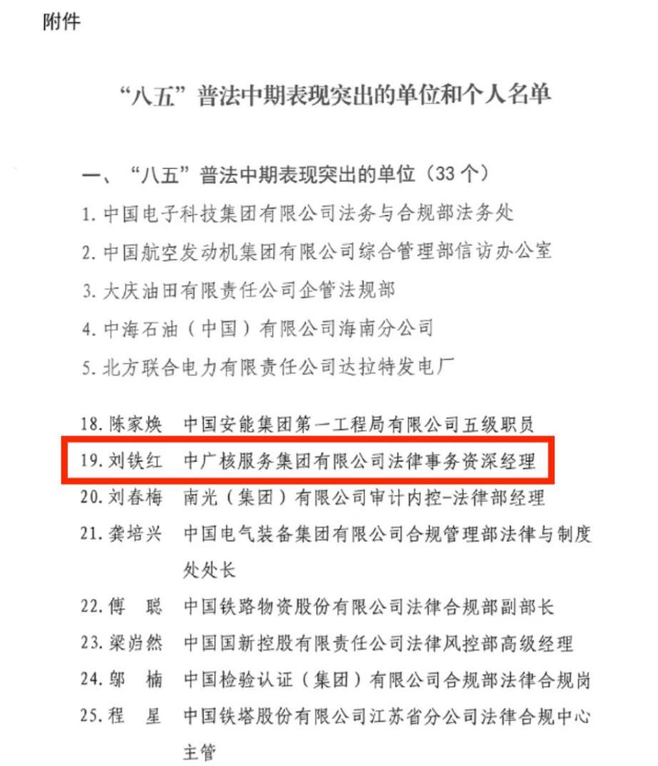 在第十一個國家憲法日來臨之際,司法部、全國普法辦聯(lián)合印發(fā)《關(guān)于通報表揚全國“八五”普法中期表現(xiàn)突出的單位和個人的通知》,中廣核服審計法務(wù)部劉鐵紅憑借在普法工作中的突出表現(xiàn),被評為“全國‘八五’普法中期表現(xiàn)突出個人”。